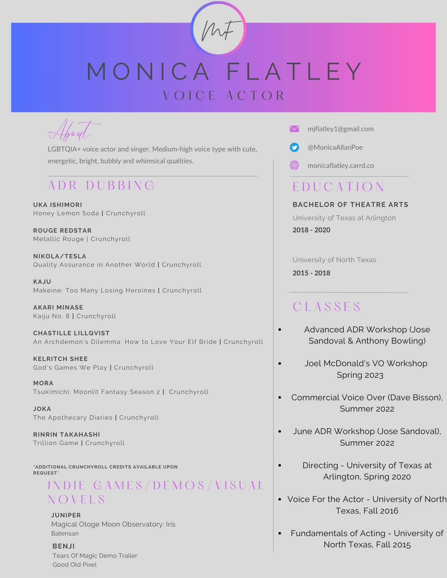 Monica Flatley is a Voice Actor located in Fort Worth, Texas with home-recording capabilities. She attended The University of North Texas, where they studied theatre arts for three years; they graduated with a Bachelor of Arts in Theatre Arts from The University of Texas at Arlington, where she continued her studies for two more years.Aside from their passion for performance, she also has a deep love of books and light novels, and spends a lot of her free time reading,